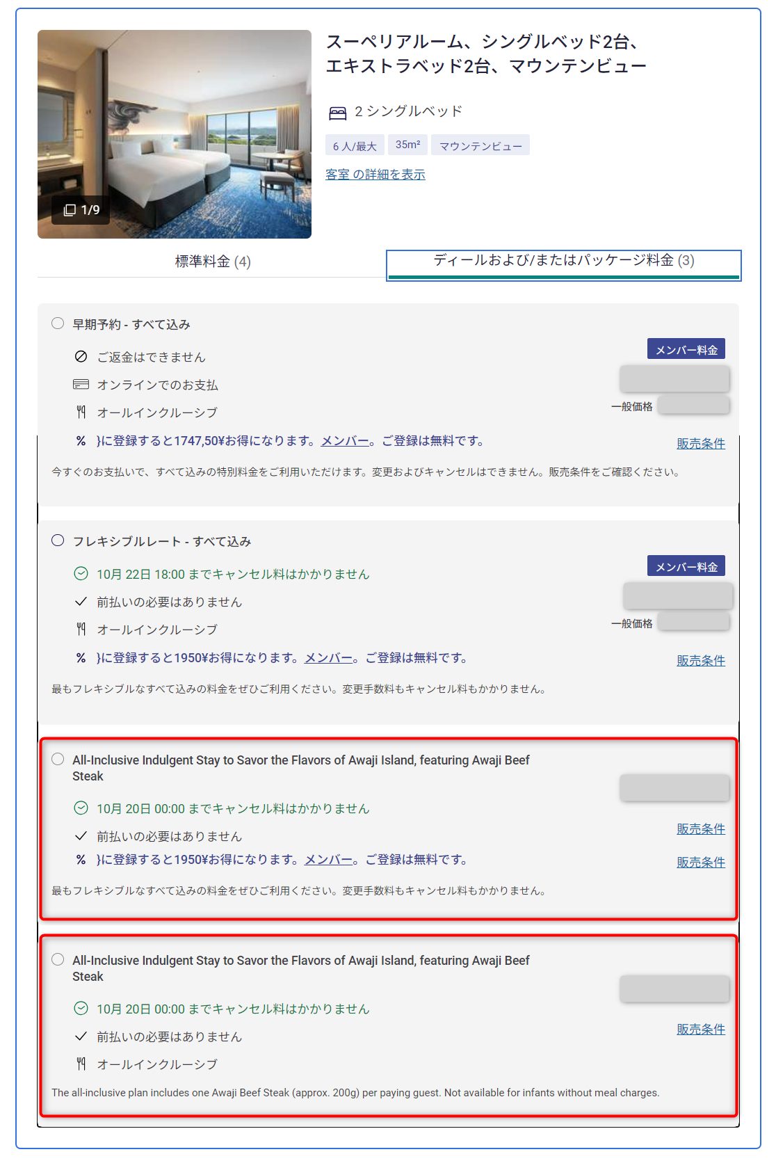 搜索住宿日期和人数,选择房间后,选择“折扣及/或包装费”,选择“享受淡路岛美味的包罗万象奢侈住宿,附带淡路牛肉排”的计划。