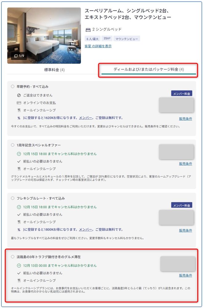 숙박일과 인원수를 검색해, 방을 선택한 후, 「딜 및/또는 패키지 요금」을 선택해, 「아와지시마의 3년 트라후그 냄비 첨부 겨울의 음식 체재」의 기재가 있는 플랜을 선택해 주세요.